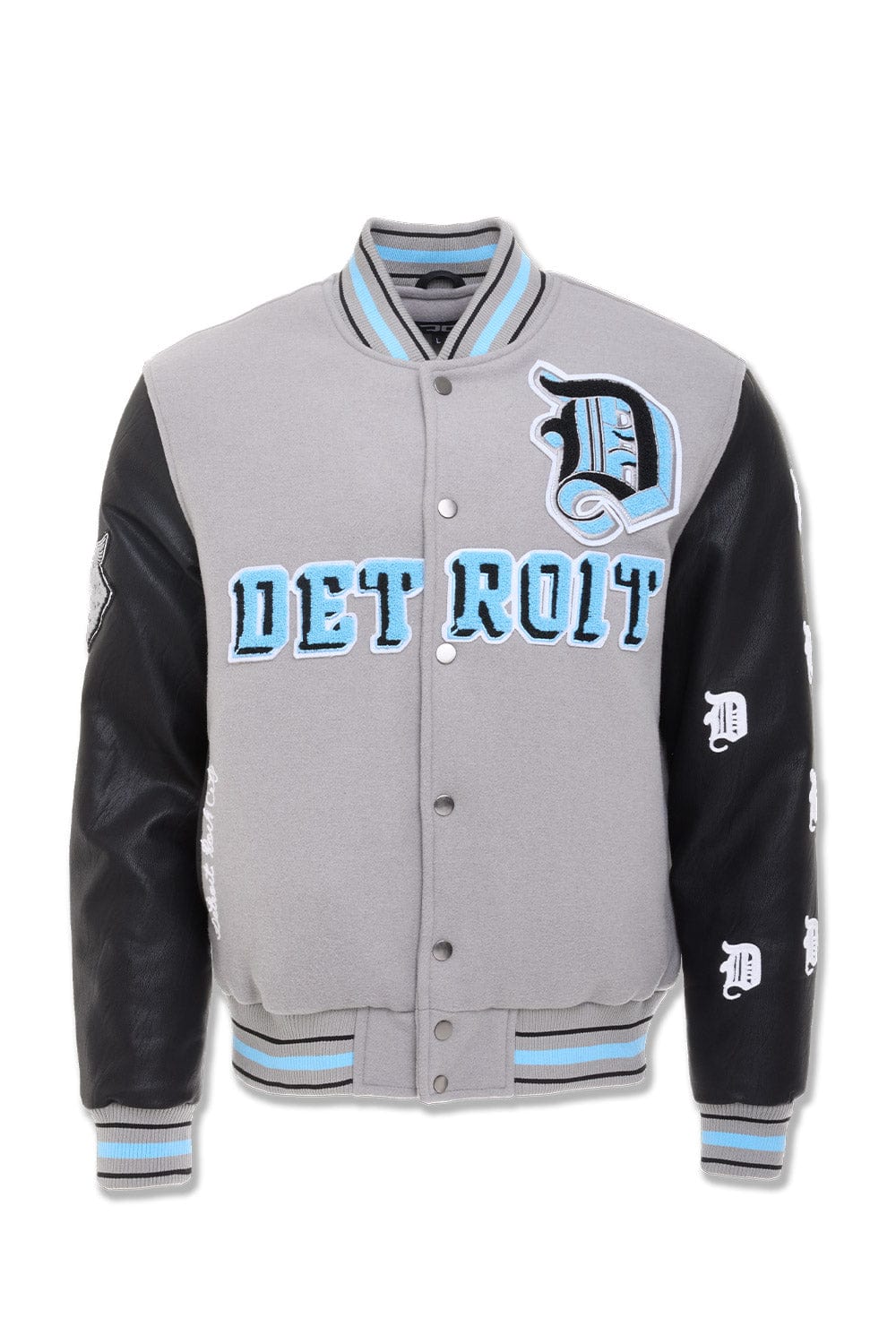 *Shomari is 6'1" and weighs 185 lbs. He is wearing our D-Town Varsity Jacket (Size Large) in Lion Grey